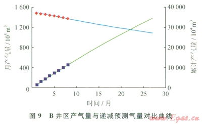 B井區(qū)投產(chǎn)氣井7口,2009年7月至2011年4月開展定壓試驗,累計產(chǎn)氣20.778 1×108m3,地質(zhì)儲量采出程度34.06%。試驗期間平均生產(chǎn)油壓為6.0MPa,產(chǎn)氣量52.0201×104m3/d;試驗?zāi)┢诰诋a(chǎn)氣量為36.8238×104m3/d(圖7、8、9)。