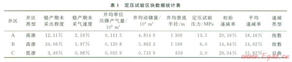 C井區(qū)屬于低滲透區(qū)塊,在穩(wěn)產(chǎn)期末采出程度僅有3.49%,各項開發(fā)指標(biāo)均低于高滲透區(qū),井均單位壓降產(chǎn)氣量僅為高滲區(qū)的1/4,泄流半徑小,儲層補(bǔ)給能量較差。C井區(qū)定壓生產(chǎn)條件下,初始遞減率高達(dá)26.04%,隨著生產(chǎn)時間延長,泄流半徑進(jìn)一步擴(kuò)大,后期產(chǎn)量遞減逐漸減緩(表1)[11]。