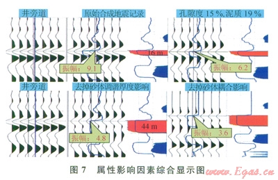 影響本區(qū)儲(chǔ)層振幅異常的因素可分為兩大類。一為儲(chǔ)層外部因素:淺層氣吸收衰減、泥巖蓋層、相鄰砂體耦合效應(yīng)。二為儲(chǔ)層自身因素:儲(chǔ)層自身物性、厚度及含水飽和度。屬性剝離技術(shù)的方法及思路為:首先找到每個(gè)儲(chǔ)層的外部影響因素,進(jìn)行定量或半定量分析后,找到相關(guān)解決方案,剔除非儲(chǔ)層因素造成的振幅假象、還原相應(yīng)厚度及物性下真實(shí)地層反射;然后根據(jù)得到的振幅信息定量分析儲(chǔ)層為何種物性及厚度;最終進(jìn)行有利儲(chǔ)層預(yù)測(cè)、含氣面積圈定和儲(chǔ)量計(jì)算。
