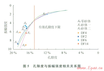 研究結(jié)果顯示(5),泥質(zhì)含量增加后,總孔隙度隨之降低,巖石速度及密度也應(yīng)該隨之增加。即當(dāng)儲(chǔ)層物性變差,儲(chǔ)層反射強(qiáng)度降低。如圖5所示,多口井測(cè)井曲線擬合趨勢(shì)基本相同。將各井實(shí)鉆儲(chǔ)層頂面振幅其他因素的影響剔除后,實(shí)鉆振幅值與正演模擬趨勢(shì)基本吻合。證明該規(guī)律可以代表真實(shí)物性變化條件下的地震反射變化情況。同時(shí),該研究結(jié)果可以將地震振幅大小與物性下限(15)相對(duì)應(yīng),當(dāng)不受調(diào)諧及其他因素影響的時(shí)候,真實(shí)氣層頂面反射振幅在3.5左右。所以對(duì)振幅強(qiáng)度低于3.5的區(qū)域在儲(chǔ)量計(jì)算時(shí)基于風(fēng)險(xiǎn)考慮,儲(chǔ)量級(jí)別相應(yīng)降低。