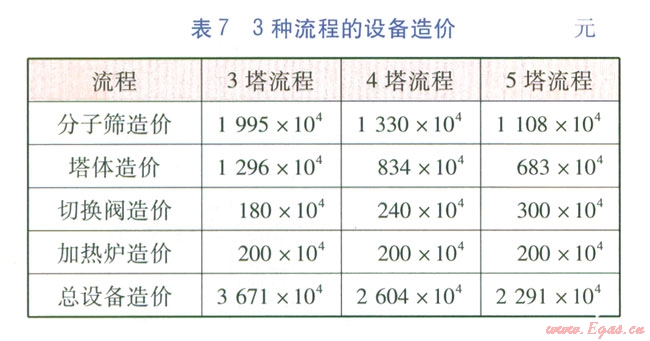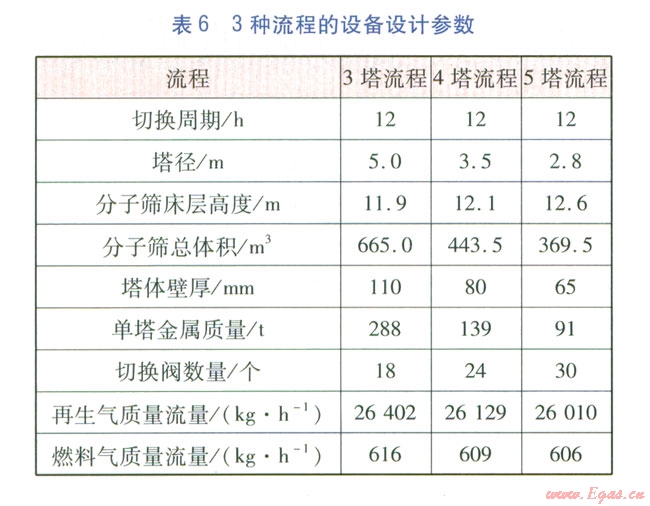 由表67可知,3塔流程的設備造價最高,由于塔徑較大,且塔體壁厚較大,導致制造難度加大,而且再生氣、燃料氣質量流量較大,運行成本較高。因此,不考慮采用3塔流程。對于4塔、5塔流程,5塔流程的設備造價低于4塔流程,且再生氣、燃料氣質量流量小于4塔流程,運行成本低于4塔流程。綜合分析,5塔流程的經濟性最優(yōu)。