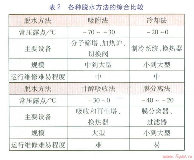 天然氣脫水方法主要有吸附法、冷卻法、甘醇吸收法、膜分離法等,各種脫水方法的綜合比較見表2。該項目為大型天然氣液化廠,要求天然氣中水的質量分數≤1×10-6,常壓露點-70℃。由表2可知,單純采用冷卻法、甘醇吸收法、膜分離法均無法滿足要求。而單純采用吸附法,易造成設備規(guī)模過大和再生氣消耗較大等問題。因此,考慮先采用冷卻法脫除原料氣中大量水分后,再采用吸附法進行深度脫水。根據天然氣液化廠的特點,天然氣液化系統(tǒng)設有制冷設備,可以提供冷源,不需要單獨增加制冷系統(tǒng)。而采用甘醇吸收法、膜分離法都需要增加相應設備,系統(tǒng)復雜,造價較高。