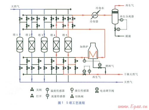 醇。塔5出口再生氣經冷卻器冷卻至40℃左右后,進入再生分離器分離出游離水和硫醇,最后進入尾氣處理單元。下一切換周期為塔23、4吸附,塔5進行冷卻,塔l進行加熱再生,這樣依次進行。