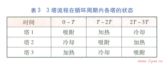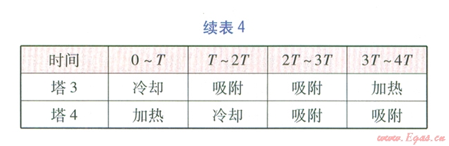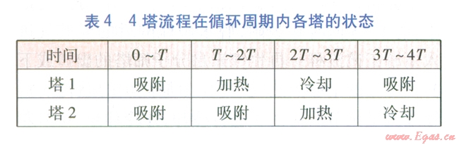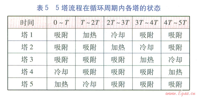 5塔流程可知,再生氣先對已加熱再生分子篩塔進行冷卻,然后經加熱爐升溫后對已完成吸附的分子篩塔進行加熱再生,這個過程是同時和連續(xù)的。當對已加熱再生分子篩塔的冷卻完成后,才能進行分子篩塔的切換,我們將分子篩塔的冷卻或加熱再牛時間稱為切換周期r。將每座塔均被加熱再生、冷卻一次的時間稱為循環(huán)周期,例如對于3塔、4塔、5塔流程,循環(huán)周期分別為3T、4T、5 T。3塔、4塔、5塔流程在循環(huán)周期內各塔的狀態(tài)分別見表35。