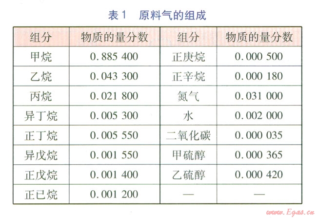 某大型天然氣液化廠的年處理量為260×104ta,在預處理系統(tǒng)中,天然氣經過油氣分離、計量后進人脫酸脫碳單元,脫除天然氣中的硫化氫、二氧化碳。從脫酸脫碳單元出來的天然氣(即脫水脫硫醇單元的原料氣)進入脫水脫硫醇單元,脫除其中的水、硫醇[1]。原料氣的工藝參數為:處理量:1000×104m3d,壓力:6.3 MPa,溫度:45℃。原料氣的組成見表1。