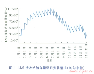 多氣源情況下,采用計算機編程進(jìn)行接收站罐容模擬,可得出LNG接收站儲存規(guī)模、LNG接收站每月庫存情況及趨勢、上游LNG船次等,同時也可以通過調(diào)整LNG船的船期與LNG接收站一起對下游“平谷抑峰",在保證下游季節(jié)調(diào)峰要求的條件下降低LNG接收站的投資額。動態(tài)分析的方法可以用于設(shè)計前期確定LNG接收站儲存規(guī)模,確定經(jīng)濟(jì)合理的儲罐數(shù)量,也可以初步掌握均勻來船和船期調(diào)整后LNG接收站庫存變化情況。