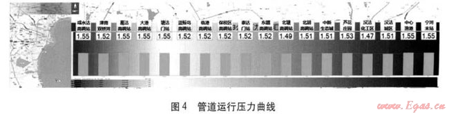 管道核心工藝圖的主要表現(xiàn)形式是按照廠站分布和管道走向,將廠站工藝和管道走向相結(jié)合。從該圖上,可以看到單條高壓管道的完整平面工藝,包括廠站內(nèi)的工藝,同時(shí)可以看到整條管道運(yùn)行壓力曲線(見圖4)、廠站工藝運(yùn)行狀態(tài)顯示。