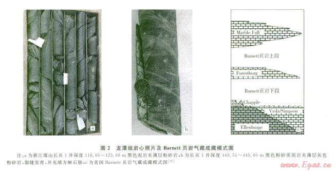 從表l中可以看出,龍?zhí)督M頁巖的TOC、R0、厚度以及地層的頂?shù)钻P(guān)系都較Lewis頁巖有更好的頁巖氣前景,而且從地層的頂?shù)钻P(guān)系來看(表1),與美國(guó)Barnett頁巖所處的地層格局(圖2-c)有很大的相似性,有利于頁巖氣的后期保存。