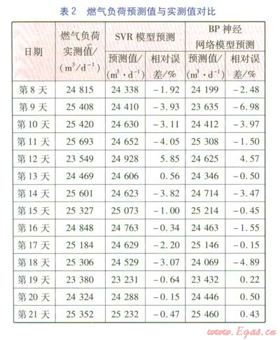 以星期幾、平均溫度、最高溫度、最低溫度、天氣情況作為SVR模型的輸入?yún)?shù),模型輸出為當(dāng)日的燃?xì)庳?fù)荷。由于各影響因素差別較大,為方便支持向量機(jī)的訓(xùn)練和學(xué)習(xí),需要將學(xué)習(xí)樣本和預(yù)測(cè)樣本數(shù)據(jù)進(jìn)行歸一化處理,通常將樣本數(shù)據(jù)調(diào)整為[0,1][-11],分別用支持向量回歸模型和BP神經(jīng)網(wǎng)絡(luò)模型進(jìn)行訓(xùn)練和預(yù)測(cè),數(shù)據(jù)對(duì)比見(jiàn)表2。其中支持向量回歸模型選擇RBF函數(shù)作為核函數(shù),參數(shù)的選擇采用網(wǎng)格劃分和交叉檢驗(yàn)來(lái)確定;BP神經(jīng)網(wǎng)絡(luò)包括1個(gè)隱含層,根據(jù)試算結(jié)果選擇9個(gè)節(jié)點(diǎn)。