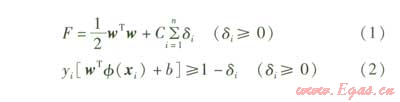 假設(shè)樣本(xiyi)i=1,,nxi∈Rn,yi∈R(Rnn維的實(shí)數(shù)空間,R為實(shí)數(shù)),支持向量機(jī)的基本原理就是將學(xué)習(xí)樣本(xi,yi)通過(guò)映射函數(shù)ø映射到一個(gè)高維特征空間,然后選擇適當(dāng)?shù)暮撕瘮?shù)K(X)和懲罰參數(shù)C,通過(guò)求解二次優(yōu)化問(wèn)題可得到松弛變量δi和參數(shù)b。