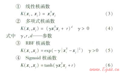 SVM中最常用的幾種核函數(shù)見(jiàn)式(3)(6),其中線性核函數(shù)可以看作是多項(xiàng)式核函數(shù)的一種特殊情況。