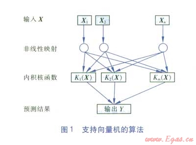 支持向量機(jī)(Support Vector Machine)簡(jiǎn)稱SVM[8],是一種監(jiān)督式學(xué)習(xí)的方法,廣泛應(yīng)用于統(tǒng)計(jì)分類以及回歸分析中,其算法見(jiàn)圖1。支持向量機(jī)首先通過(guò)內(nèi)積核函數(shù)K(X)定義的非線性變換將輸入空間X變換到一個(gè)高維空間,然后在這個(gè)空間中求最優(yōu)分類面,其輸出Y是中間節(jié)點(diǎn)的線性組合,每個(gè)中間節(jié)點(diǎn)對(duì)應(yīng)一個(gè)輸入樣本與一個(gè)支持向量的內(nèi)積,因此也被稱為支持向量網(wǎng)絡(luò)。研究表明[9-10],相對(duì)于神經(jīng)網(wǎng)絡(luò)而言,支持向量回歸模型不存在局部極小值問(wèn)題,對(duì)于解決模糊、隨機(jī)、不確定性、樣本數(shù)有限和非線性的復(fù)雜問(wèn)題具有明顯優(yōu)勢(shì)。支持向量機(jī)從結(jié)構(gòu)風(fēng)險(xiǎn)最小化原則出發(fā),為機(jī)器學(xué)習(xí)提供了一個(gè)嶄新的方法,被認(rèn)為是小樣本學(xué)習(xí)中一種很好的機(jī)器學(xué)習(xí)算法。