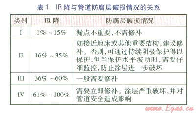IR降越大,陰極保護(hù)程度越低,即埋地管道防腐層缺陷面積越大,可見(jiàn)DCVG能夠較準(zhǔn)確地預(yù)測(cè)防腐層缺陷的面積,并能對(duì)整個(gè)管道的陰極保護(hù)效果做出客觀的判斷。IR降與防腐層破損情況的關(guān)系見(jiàn)表1。