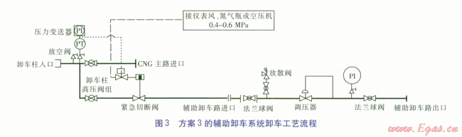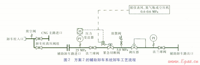 ②從安全角度對(duì)3種輔助卸車方案進(jìn)行比較,認(rèn)為第2種方案更具優(yōu)勢(shì)。在不影響供氣量的前提下,不僅使CNG氣瓶車的余氣量更少,還大大縮短了卸車時(shí)間,提高了CNG氣瓶車的運(yùn)輸能力,大大降低了綜合運(yùn)營(yíng)成本。