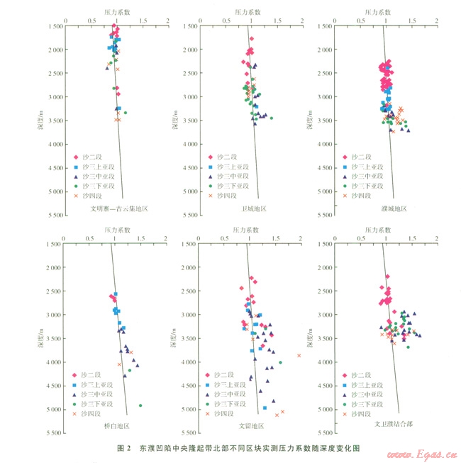 1)東濮凹陷中央隆起帶北部古近系現(xiàn)今地層壓力在縱向上主要發(fā)育常壓、超壓和超高壓3種類型;其中文明寨-古云集地區(qū)斷裂體系比較發(fā)育,異常壓力保存條件差,以常壓為主;衛(wèi)城、濮城和橋白地區(qū)沙三段的膏鹽巖或泥巖較為發(fā)育,可以較好地封堵異常壓力,從而發(fā)育常壓和超壓;文留地區(qū)和文衛(wèi)濮結(jié)合部沙三段膏鹽巖尤其發(fā)育,異常壓力保存條件優(yōu)于其他區(qū)塊,從而發(fā)育常壓、超壓和超高壓。