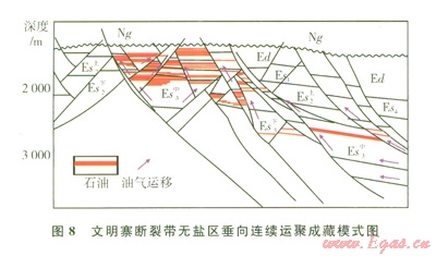 該成藏模式主要分布于無鹽巖發(fā)育的復(fù)雜斷裂帶,屬于常壓環(huán)境油氣藏的油氣成藏模式類型。這種模式油氣藏的油氣主要是在浮力作用下沿?cái)嗔严蛏线B續(xù)運(yùn)移。以文明寨地區(qū)為代表(圖8)。該成藏模式具有如下特點(diǎn):①具有沙三上、中、下亞段3套烴源巖供烴;②以垂向連續(xù)運(yùn)移為主,側(cè)向運(yùn)移為輔;③圈閉類型主要為斷塊圈閉;④運(yùn)移動力主要是浮力;⑤縱向上烴類聚集層系沿主干斷裂呈羽狀分布。