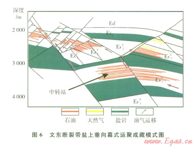 屬于鹽上油氣藏的油氣成藏模式類型。斷裂帶下部鹽間或鹽下地層中的砂體是油氣幕式運(yùn)移的臨時(shí)倉儲層或“中轉(zhuǎn)站”,由于下部流體的超壓作用,這些砂體中的流體沿?cái)鄬又芷谛葬尫哦鴮⒂蜌獯罅哭D(zhuǎn)移到上部地層。主要發(fā)生于斷裂活動期,具有早期充注的特點(diǎn),以衛(wèi)城地區(qū)向南至文留地區(qū)為代表(圖6)。該成藏模式具有如下特點(diǎn):①具有沙三上、中、下亞段3套烴源巖供烴;②以垂向幕式運(yùn)移為主、側(cè)向運(yùn)移為輔;③圈閉類型主要為復(fù)雜斷塊圈閉;④運(yùn)移動力主要是超壓;⑤縱向上烴類聚集層系沿主干斷裂呈羽狀分布。