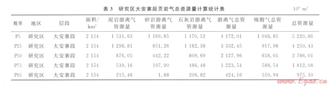通過統(tǒng)計(jì)出的每口井含氣頁巖層段的厚度,可以繪制出含氣頁巖層段厚度等值線圖,同時(shí)結(jié)合地震資料追蹤有效層段,控制平面上等值線的走勢(shì)。根據(jù)研究區(qū)塊大安寨段巖石物性分析測(cè)試數(shù)據(jù),大安寨段頁巖密度平均為2.61 g/cm3。根據(jù)實(shí)例井大安寨段實(shí)測(cè)TOC資料及現(xiàn)有的測(cè)井資料進(jìn)行了多元統(tǒng)計(jì)分析擬合,計(jì)算出吸附氣量,繪制TOC等值線圖及吸附氣量等值線圖,計(jì)算出吸附氣資源量;根據(jù)實(shí)測(cè)孔隙度資料、現(xiàn)有的測(cè)井?dāng)?shù)據(jù)分別分析擬合、計(jì)算孔隙度,進(jìn)而計(jì)算含水(氣)飽和度和游離氣百分含量,最終得到游離氣資源量;最后計(jì)算m該研究區(qū)不同概率的總資源量(表3)。