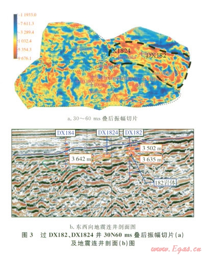 通過(guò)地震屬性分析、地震剖面刻畫(huà)進(jìn)行火山巖體輪廓追蹤識(shí)別及內(nèi)幕結(jié)構(gòu)精細(xì)解釋[10],可以清楚地看到DX182、DX1824井試采井段同屬“182”次火山巖體(圖3),其火山巖儲(chǔ)層的連續(xù)性好,這也從地質(zhì)上證明了DX182、DX1824兩口井連通。