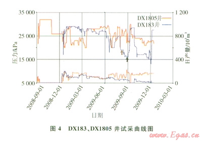 DX 183與DX1805井投產(chǎn)時(shí)間接近,但兩口井壓力下降的趨勢(shì)卻具有明顯的差別,不具有同步下降的特征(圖4);2009年9月,全氣田關(guān)井后,兩井壓力恢復(fù)值差別較大,應(yīng)不屬于同一壓力系統(tǒng)。