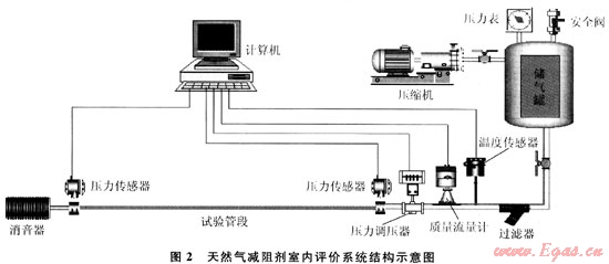 由于目前國(guó)內(nèi)天然氣減阻劑的研究尚處于實(shí)驗(yàn)階段,還沒有建立起天然氣減阻劑減阻性能評(píng)價(jià)標(biāo)準(zhǔn)。參照現(xiàn)有“原油減阻劑減阻性能評(píng)價(jià)系統(tǒng)”,與中國(guó)石油管道科技研究中心合作設(shè)計(jì)制作了國(guó)內(nèi)首個(gè)天然氣減阻劑室內(nèi)評(píng)價(jià)系統(tǒng),其結(jié)構(gòu)示意圖如圖2所示[6]。