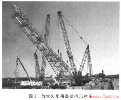 2009年6月16日和6月19日,采用整體滑移法分別完成了第1、2座放空火炬的吊裝,每座放空火炬的吊裝僅用了約50min,安全、順利、快捷,而且吊耳梁沒(méi)有任何變形。放空火炬吊裝就位示意圖如圖2所示。若采用分段吊裝、空中組對(duì)方案,不僅需要搭設(shè)高空組裝平臺(tái),安全風(fēng)險(xiǎn)大,進(jìn)度慢,而且要進(jìn)行2次400t履帶吊車(chē)塔式工況組裝和1次塔式工況拆除,至少需要11d時(shí)間,分段吊裝每座放空火炬又至少需要2d時(shí)間,此外,因占用400t吊車(chē)時(shí)間長(zhǎng),還會(huì)影響其他大型設(shè)備吊裝作業(yè),延緩工程施工工期。因此,采用分解吊點(diǎn)受力法整體吊裝放空火炬,不僅提前13d完成放空火炬吊裝任務(wù),節(jié)省400t履帶吊車(chē)租用費(fèi)36萬(wàn)元,加快了整個(gè)工程大型設(shè)備吊裝進(jìn)度,特別是在施工現(xiàn)場(chǎng)緊缺吊耳梁材料的情況下,采用分解吊點(diǎn)受力的方法,成功解決了吊耳梁強(qiáng)度不足的難題,實(shí)現(xiàn)了吊耳梁以小代大的嘗試,圓滿完成了大型放空火炬吊裝任務(wù),在吊裝技術(shù)上是一種創(chuàng)新。