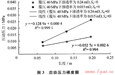 計(jì)算得出的f值就是啟動(dòng)壓力梯度(圖3)。計(jì)算表明:覆壓40MPa下滲透率為0.12~0.312mD(平均值0.24mD)巖心的啟動(dòng)壓力梯度為0.0527MPa/m;覆壓40MPa下滲透率為0.015mD巖心的啟動(dòng)壓力梯度為0.1289MPa/m。