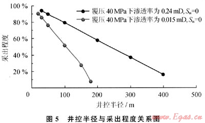 采用該方法對(duì)蘇里格氣田單井理論最大采出程度進(jìn)行計(jì)算,其結(jié)果見(jiàn)圖5。對(duì)于蘇里格氣田,其原始地層壓力在25MPa左右,則覆壓40MPa下滲透率為0.12~0.312mD(平均值0.24mD)的不含水儲(chǔ)層在井控泄流半徑400m范圍內(nèi)理論最大采出程度在15%以上,覆壓40MPa下滲透率為0.015mD的不含水儲(chǔ)層在井控泄流半徑200m范圍內(nèi)理論最大采出程度在7%以上。