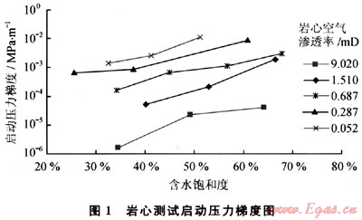 啟動壓力梯度定義為作用在流體上的壓差達(dá)到一定程度時,流體克服黏滯力開始流動時的壓力梯度。在低滲透氣藏中,氣體滲流是否存在啟動壓力梯度以及啟動壓力梯度產(chǎn)生的條件一直是石油工作者研究和爭論的焦點(diǎn)之一。持肯定觀點(diǎn)的學(xué)者認(rèn)為天然氣在高溫高壓條件下與孔隙界面會產(chǎn)生一定的界面效應(yīng),或因?yàn)榭紫吨兴拇嬖诙率箽怏w滲流存在一定的啟動壓力梯度。持否定觀點(diǎn)的研究人員認(rèn)為天然氣分子小,易于流動,在孔隙介質(zhì)中流動不存在啟動壓力梯度,如果說因?yàn)榭紫吨泻幸欢柡投鹊乃率箽怏w在某些條件下不流動,應(yīng)歸于兩相滲流的問題。筆者認(rèn)為:啟動壓力梯度概念能較好的反映氣體流動的動態(tài)特征,綜合反應(yīng)了儲層物性、含水及驅(qū)動壓力對氣體滲流的影響,在滲流方程中引入啟動壓力梯度,能更好地描述低滲儲層的滲流特征,確定氣井的有效動用范圍,為低滲氣藏開發(fā)井距的確定和井網(wǎng)優(yōu)化部署提供依據(jù)。根據(jù)實(shí)驗(yàn)分析,同一物性巖樣,含水飽和度越大,啟動壓力梯度越大;巖石物性越差,啟動壓力梯度越大,并且受含水飽和度影響更顯著(圖1)。