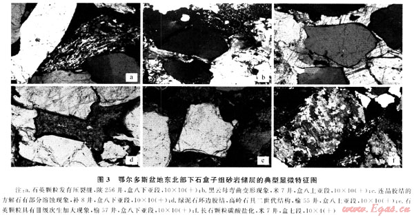 由世代膠結(jié)物充填之后余下的孔隙直徑大于0.01mm的粒間孔隙,這類孔隙是鄂爾多斯盆地東北部?jī)?yōu)質(zhì)天然氣儲(chǔ)層的主要孔隙類型之一(圖1-a、b)。