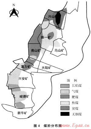 例如峻德、興安礦區(qū)主要為氣煤和長焰煤,興安北部的富力、大陸、南山礦變?yōu)榉拭海列乱坏V深部、鳥山區(qū)變?yōu)榻姑海傧虮狈植加胸毭汉蜔o煙煤(圖4)。因此煤變質(zhì)程度較高的南山、新一礦煤層瓦斯含量相應(yīng)增高,使得礦井瓦斯涌出量較大,屬高瓦斯突出礦區(qū)。
