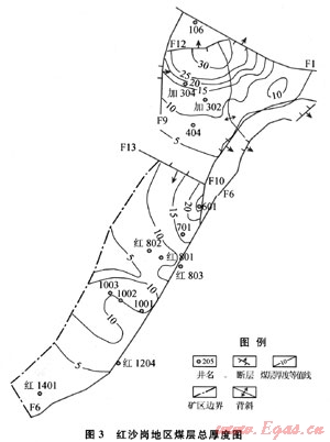 由于受華北板塊的俯沖擠壓作用,北大山剛性隆起,山前因構(gòu)造負荷效應(yīng)而彎曲沉陷,在北大山隆起和紅沙崗沉陷的接合部位(應(yīng)力集中區(qū))發(fā)生了逆沖斷層(F1),盆緣斷裂F1和馬祖凸起構(gòu)成了紅沙崗主干控制構(gòu)造,在鄰近F1斷層的北部,一般坳陷較深,煤系地層沉積較厚,而遠離F1、近馬祖隆起的南部地帶,則含煤巖系沉積厚度小,甚至地層尖滅,含煤性也差。因此,F(xiàn)1盆緣斷裂是有利于成煤和護煤的構(gòu)造帶。