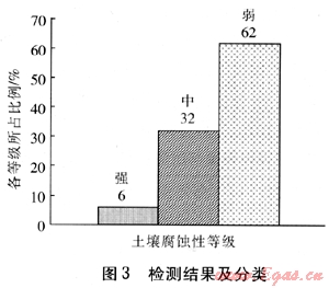 對(duì)埋地鋼管沿線的土壤腐蝕性采用等距法檢測(cè),儀器采用ZC-8型土壤電阻率測(cè)量?jī)x,共測(cè)量99處。其土壤電阻率范圍為15.08~207.37Ω·m,檢測(cè)結(jié)果及分類見(jiàn)圖3。