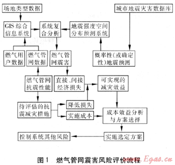 城市燃?xì)夤芫W(wǎng)震害風(fēng)險評價涉及到場地類別、地震強(qiáng)度、燃?xì)夤芫W(wǎng)參數(shù)與抗震性能、抗震減災(zāi)措施和GIS信息系統(tǒng)等方面,其典型流程見圖1[8]。
