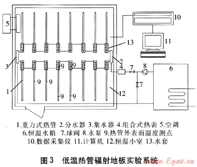 碳鋼/水重力式熱管(又稱碳鋼/水兩相閉式熱虹吸管)具有結(jié)構(gòu)簡(jiǎn)單、成本低廉、傳熱性能優(yōu)良、工作可靠等特點(diǎn),在冶金、化工、建材、動(dòng)力等行業(yè)有很多成功的應(yīng)用實(shí)例[1]。隨著熱管技術(shù)的不斷成熟,其在建筑行業(yè)的應(yīng)用引起了學(xué)者們的關(guān)注。JEBRAIL等制作了熱管散熱器并測(cè)試了其熱工性能[2],國內(nèi)學(xué)者蔣愛華等對(duì)熱管輻射墻壁進(jìn)行了探討[3],羅清海等分析了不同工質(zhì)熱管散熱器的熱工性能[4]。本文擬將碳鋼/水重力式熱管與地板輻射采暖系統(tǒng)結(jié)合起來,以期利用其優(yōu)良的傳熱性能,在提供舒適熱環(huán)境的同時(shí),達(dá)到降低供水溫度、減小熱水循環(huán)流量、提高系統(tǒng)整體運(yùn)行效率和經(jīng)濟(jì)性的目的。本文在重力式熱管和串聯(lián)熱管傳熱性能研究的基礎(chǔ)上[5],對(duì)低溫?zé)峁茌椛涞匕宓臒峁ば阅苓M(jìn)行實(shí)驗(yàn)研究。