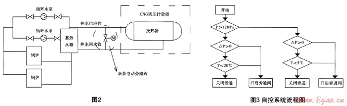根據(jù)計(jì)算值,循環(huán)水供水溫度不低于21.9℃即可,因此時(shí)循環(huán)水溫度在46℃左右,為簡(jiǎn)化控制流程,可在供回水管上設(shè)置一只等徑旁路閥,分流經(jīng)過換熱器的流量,并根據(jù)燃?xì)獬隹跍囟戎祦砜刂婆月烽y的開啟或關(guān)閉,以實(shí)現(xiàn)溫度的自動(dòng)控制。