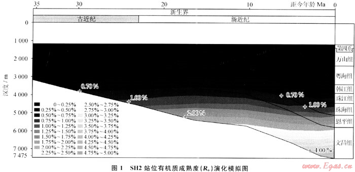 2007年4~6月,廣州海洋地質(zhì)調(diào)查局在神狐海域研究區(qū)內(nèi)實施了天然氣水合物鉆探,先后在3個站位成功鉆獲了天然氣水合物實物樣品,對其中的SH2站位沉積物樣品中的氣體進行的氣相色譜分析的結(jié)果顯示[10]:CH4的體積分數(shù)占96%~99%,C2H6和C3H8的體積分數(shù)很低,干燥系數(shù)(C1/C2)一般在數(shù)百至1000以上,為典型的干氣。SH2站位含水合物層的總有機碳含量平均值為0.43%,已達到了作為生物氣烴源巖的標(biāo)準(zhǔn),對SH2站位進行有機質(zhì)成熟度的熱演化模擬(圖1),結(jié)果表明:淺部地層珠江組、韓江組、粵海組和萬山組Ro值低于0.7%,多在0.2%~0.6%,處于未熟-低成熟的生烴門限附近,屬于良好的生物氣的烴源巖。這幾套層序厚度大,泥巖含量高,熱成熟低,有機質(zhì)豐度較高[11],其中,上中新統(tǒng)-第四系海相泥巖有機碳含量平均為0.22%~0.49%,且不同層位及層段均變化不大,第四系有機碳含量平均為0.22%~0.28%,上新統(tǒng)有機碳含量平均為0.30%~0.39%,上中新統(tǒng)有機碳含量平均為0.49%;上中新統(tǒng)-全新統(tǒng)海相泥巖生烴潛力(S1+S2)平均為0.13~0.32mg/g,與鶯歌海盆地大體一致。由此推測,該區(qū)具備生成生物氣的巨大潛力。