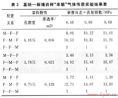 基塊物性不變,變換裂縫-基塊配置關(guān)系,對比各個(gè)配置關(guān)系傳質(zhì)效率,表2實(shí)驗(yàn)結(jié)果表明:F-F-M配置關(guān)系傳質(zhì)效率最低,以F-M-F配置關(guān)系傳質(zhì)效率最優(yōu)。實(shí)驗(yàn)數(shù)據(jù)統(tǒng)計(jì)表明:F-M-F配置傳質(zhì)效率是F-F-M配置的10~16倍,M-F-F配置傳質(zhì)效率是F-F-M配置的1~13倍。