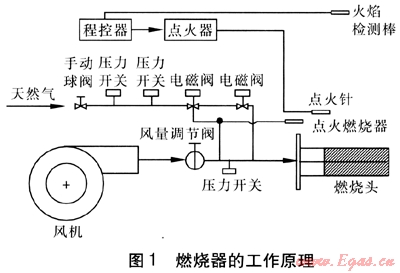 為了滿足實(shí)際應(yīng)用的需要,選用比例閥控制及燃燒控制系統(tǒng),使其具備預(yù)吹掃、自動點(diǎn)火、火焰檢測、熄火保護(hù)報(bào)警、燃?xì)飧叩蛪罕Wo(hù)、風(fēng)機(jī)故障保護(hù)、負(fù)荷可調(diào)等功能。燃燒器的工作原理見圖1。