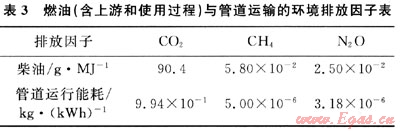 運(yùn)輸階段的污染物排放主要來(lái)自于燃料燃燒(汽油和柴油)的排放。不同的運(yùn)輸方式,其燃料種類、能源強(qiáng)度及燃料燃燒排放系數(shù)均不同。其中,汽車、油輪、貨船和火車的單位載重單位里程燃料消耗量分別為0.10267、0.10062、0.10030、0.10072kg/(t·km),燃油的生命周期溫室氣體排放[5~6]見(jiàn)表3。