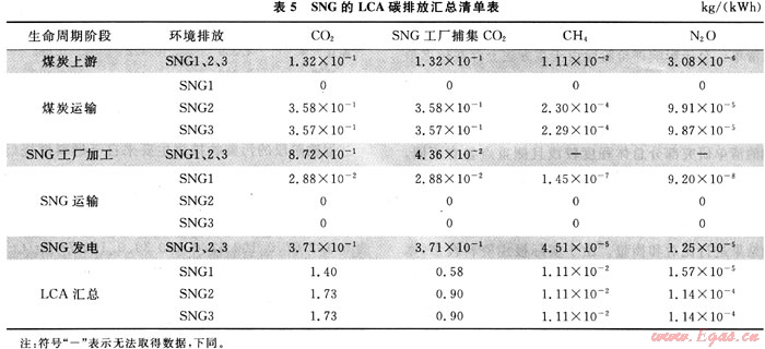 根據(jù)中國(guó)資源與市場(chǎng)分布的實(shí)際情況,這里考慮3種方案:①SNG工廠建址于煤礦坑口附近,通過(guò)1000km的長(zhǎng)輸管道運(yùn)輸至目標(biāo)市場(chǎng)(SNG1);②SNG工廠建目標(biāo)市場(chǎng)附近,通過(guò)1000km火車貨運(yùn)煤炭至SNG工廠(SNG2);③基本情況同②,但采用船運(yùn)(SNG3)。SNG工廠的加工轉(zhuǎn)換效率取52.6%,SNG發(fā)電效率取52%。SNG項(xiàng)目作為煤化工的一種,在C02捕集方面具有天生的優(yōu)勢(shì),如果按照可實(shí)現(xiàn)的捕集效率95%計(jì)算,則對(duì)SNG生命周期內(nèi)的碳排放帶來(lái)重大影響。SNG的LCA碳排放清單匯總結(jié)果見(jiàn)表5。