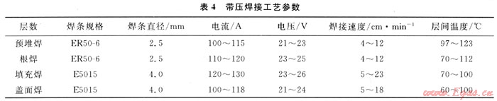 封堵操作過(guò)程必須嚴(yán)格進(jìn)行氣體置換,安裝設(shè)備后使用氮?dú)庵脫Q空氣,拆除設(shè)備前使用氮?dú)庵脫Q天然氣,每次都要填寫(xiě)氣體檢測(cè)記錄表。確定開(kāi)孔、封堵三通位置;剝防腐層,除去管線表面油污、底漆;測(cè)量管線橢圓度及壁厚,必須符合標(biāo)準(zhǔn)要求;選擇封堵三通、旁通三通、下囊短節(jié)和2號(hào)平衡短節(jié)位置;焊接封堵三通、旁通三通、下囊短節(jié)和2號(hào)平衡短節(jié),并對(duì)三通、短節(jié)所有焊道進(jìn)行滲透探傷檢驗(yàn)。焊接參數(shù)如表4所示。