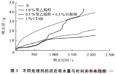 對比吸水量與時間關系曲線可知,泥巖在清水中的吸水量上升的最快,同一時間內吸水量也最大。從總吸水量上來看,聚乙烯醇大于CTAB潤濕反轉劑,大于聚乙烯醇和硅酸鉀混合溶液,說明聚乙烯醇和硅酸鉀混合溶液的抗毛細管力自吸能力很好。CTAB潤濕反轉劑相對封堵型的處理劑,吸水量還是略高,抑制效果稍差。通過此項實驗,能有效地模擬評價處理劑抑制泥頁巖自吸水的性能。