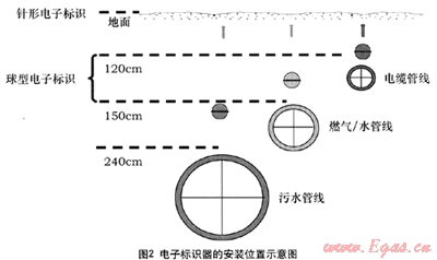用于標(biāo)識燃?xì)夤艿馈⒐┧艿?、污水管道電纜的電子標(biāo)識器各自的安裝位置示意圖如下圖2所示。