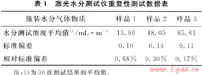 重復(fù)性是儀器的重要技術(shù)指標(biāo),直接影響分析結(jié)果的不確定度。在實驗室對儀器的重復(fù)性進(jìn)行了考察。測試對象為中國測試技術(shù)研究院制備的3瓶瓶裝水分氣體物質(zhì)(補充氣為氮氣),用SS2000激光水分測試儀對每瓶氣體進(jìn)行了連續(xù)1h的測試,測試結(jié)果見表1。