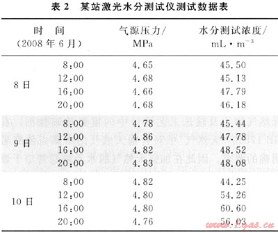 SS2 000激光水分測試儀在某輸氣站運行了4個月,對站場進(jìn)氣進(jìn)行實時監(jiān)測,于每天8:00、12:O0、16:00和20:O0分別記錄儀器的測試數(shù)據(jù),2008年6月8~10日的測試結(jié)果見表2。