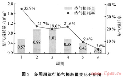 運(yùn)行初期氣庫(kù)快速擴(kuò)容,墊氣損耗量增加,損耗率較高,之后進(jìn)入穩(wěn)定擴(kuò)容階段,墊氣損耗量開(kāi)始減少,損耗率隨之大幅降低,其變化示意圖見(jiàn)圖5。前3個(gè)周期損耗量由0.572×108m3增至1.101×108m3,增幅為92%;隨后3個(gè)周期快速降至0.221×108m3,降幅達(dá)80%。墊氣損耗率由35.9%降低到3.6%,降幅達(dá)90%。