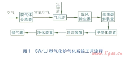 SW/LJ固定床反火型生物質(zhì)氣化爐是生物質(zhì)氣化集中供氣系統(tǒng)的核心,該氣化爐主要功能是把生物質(zhì)等固體原料轉(zhuǎn)換成氣體燃料。具體工藝流程見圖l。生物質(zhì)原料由爐頂送入氣化爐,同時,加入由膜氣體分離器產(chǎn)生的富氧空氣,經(jīng)過熱解氧化和還原反應(yīng),產(chǎn)生的燃?xì)庀冗M入旋風(fēng)除塵器分離出燃?xì)庵休^大的顆粒飛灰,然后進入焦油裂解裝置,對焦油進行深度裂解;而后,生物質(zhì)燃?xì)膺M入甲烷化裝置進行反應(yīng);之后再經(jīng)過冷卻裝置使氣體迅速降至室溫;最后,經(jīng)凈化裝置過濾即可得到清潔燃?xì)?,成品燃?xì)膺M入儲氣罐儲存。
