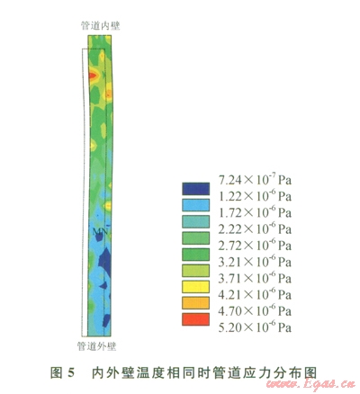 由計(jì)算可知,在x軸處有固定墩約束軸向位移,管道無(wú)內(nèi)外壓作用,管道外壁熱量損耗,較內(nèi)壁溫差不大時(shí)(圖4),管道內(nèi)壁溫度為氣體溫度50℃,熱量由內(nèi)壁沿徑向均勻分布于外壁,因此,在內(nèi)外壁產(chǎn)生了不均勻的熱應(yīng)力。當(dāng)內(nèi)外壁溫度相同、沒有溫差影響時(shí)管道內(nèi)壁(圖5),管道內(nèi)外壁溫度為50℃。在一端固定墩的約束下,管道應(yīng)力分布極不均勻,軸向伸長(zhǎng)量達(dá)到0.019mm,這是由于溫度影響產(chǎn)生的熱脹冷縮效應(yīng),管道增加的應(yīng)力經(jīng)過軸向的伸長(zhǎng)補(bǔ)償,減小了應(yīng)力集中分布的趨勢(shì),從而在軸向產(chǎn)生了較大的位移。