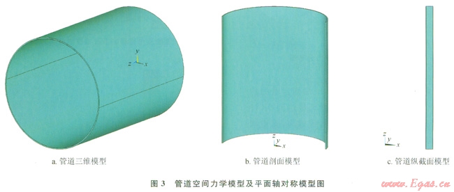 根據(jù)彈性力學(xué)和有限元理論,管道熱應(yīng)力和外擠載荷的空間問題可以應(yīng)用平面應(yīng)力及軸對(duì)稱建立平面有限元模型,計(jì)算分析管道的應(yīng)力分布及大小如圖3所不。圖3-a為1219mm外徑X80管道空間力學(xué)模型;圖3-b為X80管道三維剖面,以2軸為對(duì)稱軸;圖3-c為管道縱軸旋轉(zhuǎn)截面,以z軸為對(duì)稱軸旋轉(zhuǎn)。